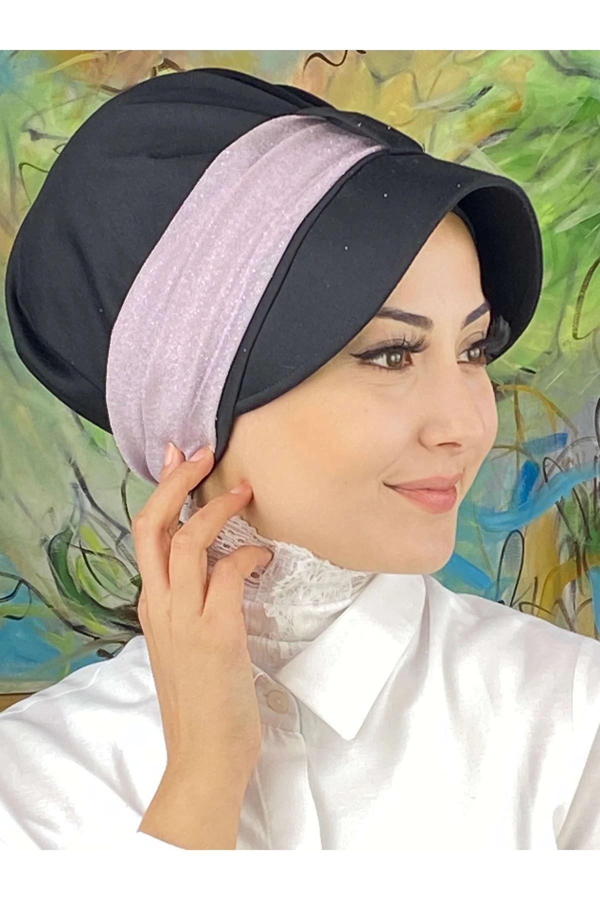 Cırtcırtlı Toz Pembe Simli Şifon Fularlı Şapka